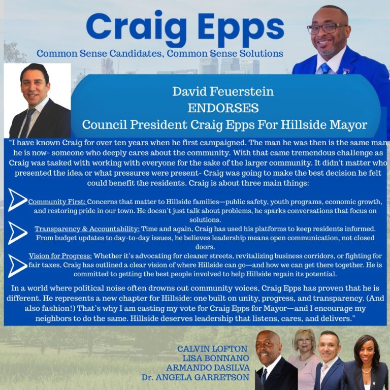 Craig Epps, current Council President, has received a strong endorsement from David Feuerstein in his campaign for Hillside Mayor. Feuerstein, who has known Epps for over a decade, praised him as a leader who consistently puts the community first, values transparency, and has a clear vision for the township’s future.